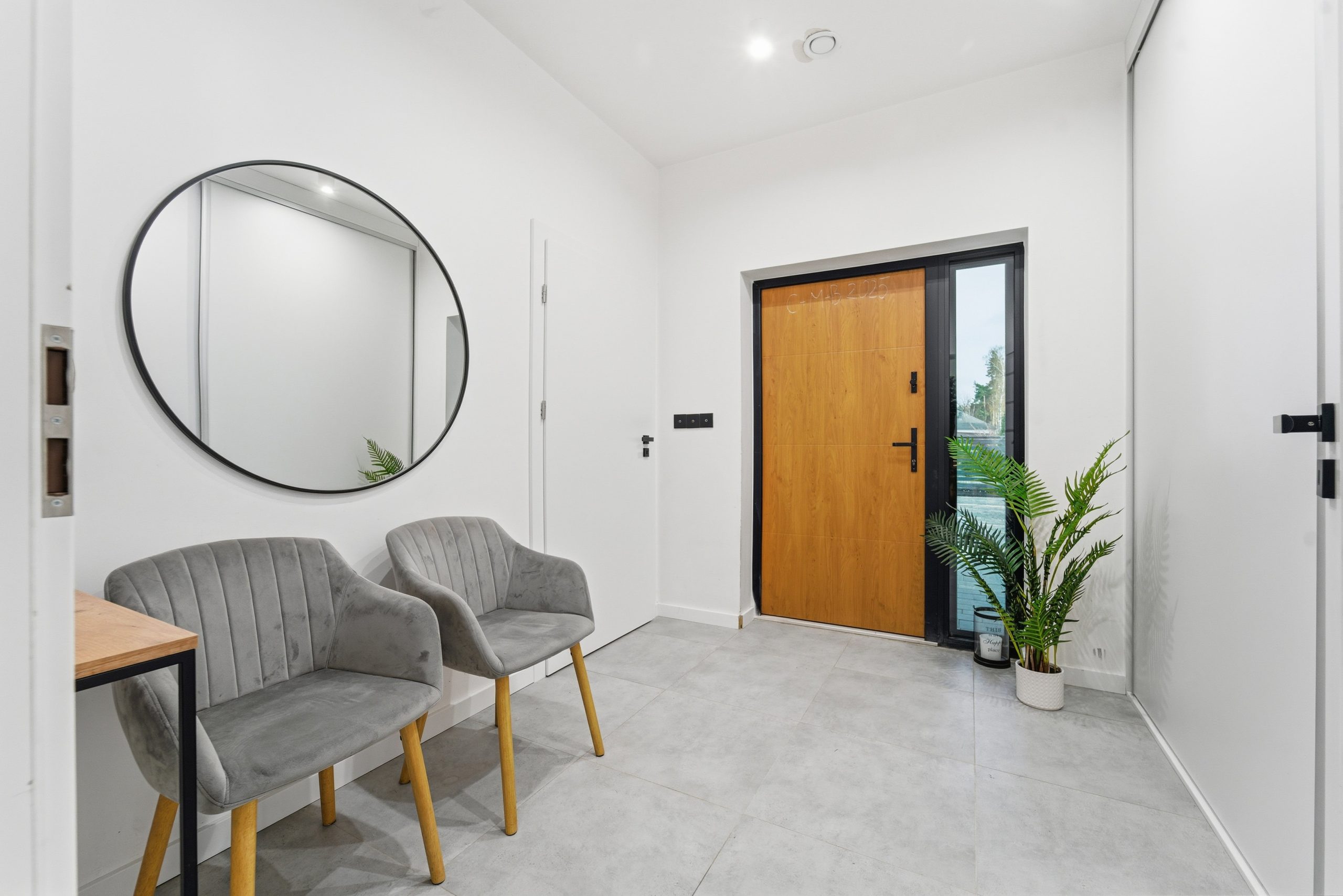 W wiatrołapie czeka ogromna zabudowana szafa — idealna, by życie od pierwszej minuty było wygodne i poukładane. Stąd przejdziesz również bezpośrednio do dużego garażu na dwa auta (41 m²) — praktyka w najlepszym wydaniu.