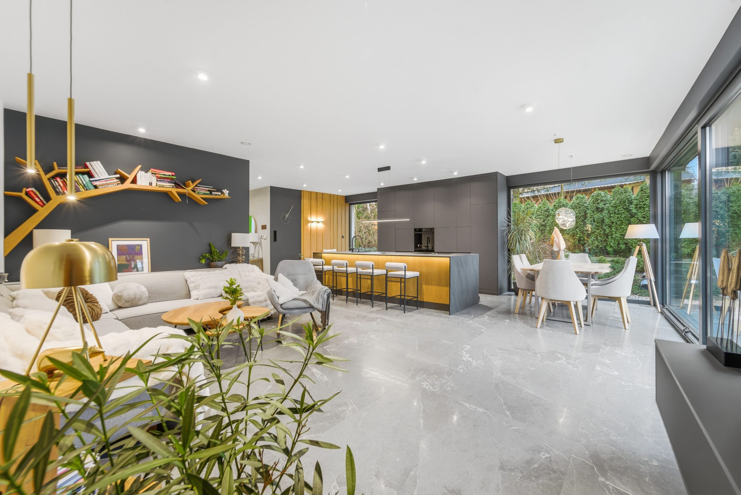 Parter domu został zaprojektowany przez Pracownię Manuka. Dom jest umeblowany i w pełni wyposażony – gotowy do zamieszkania od razu, bez remontów i bez czekania.