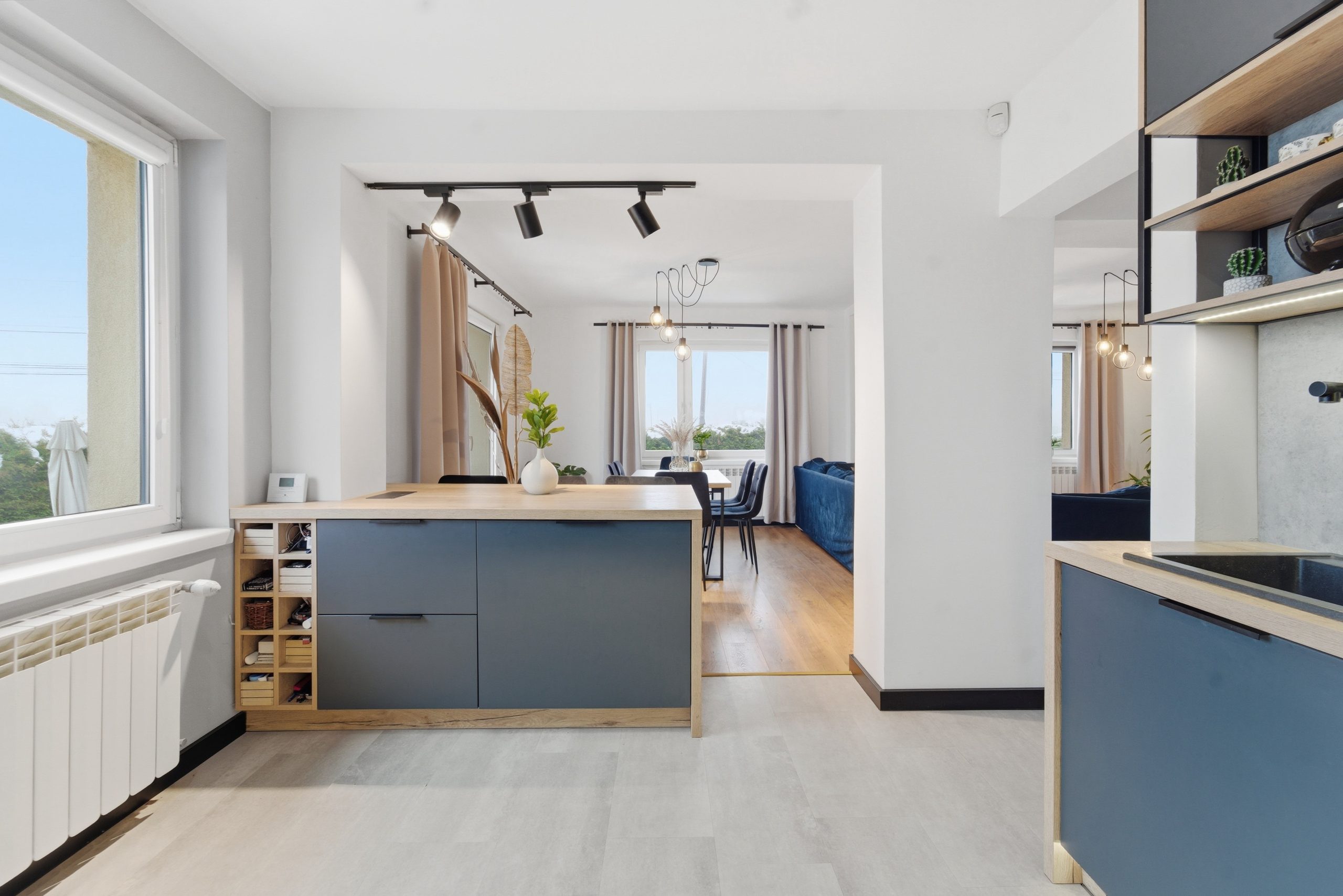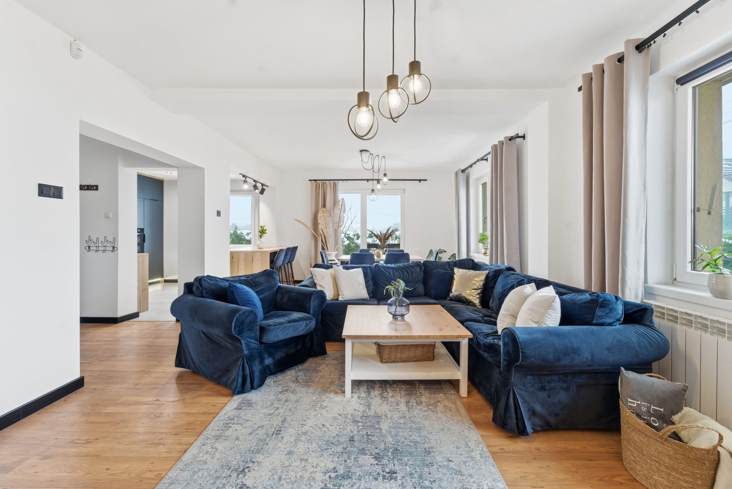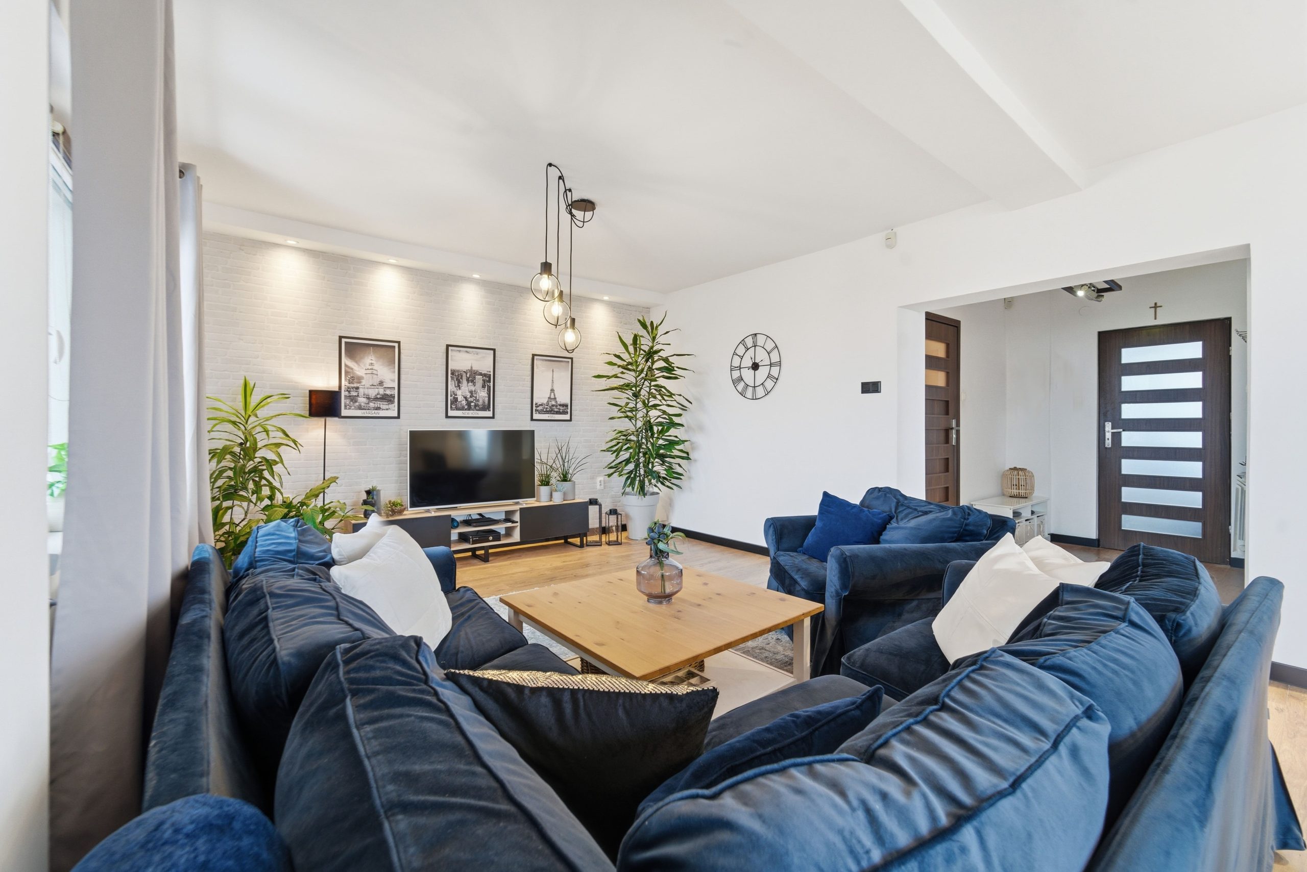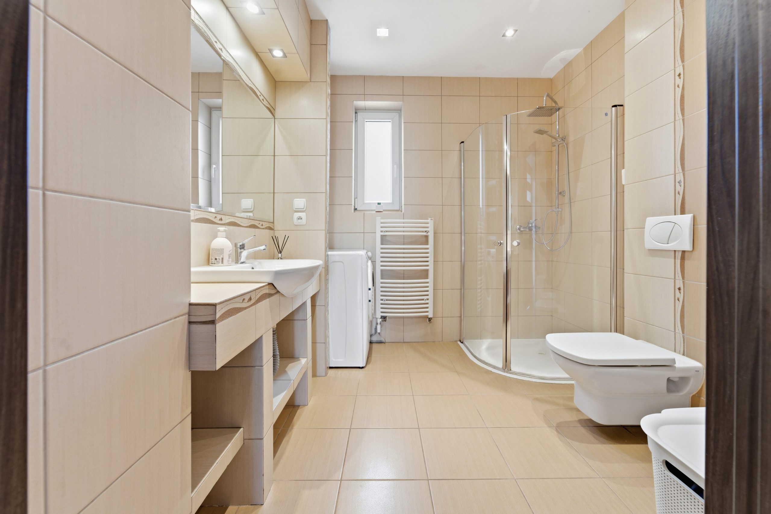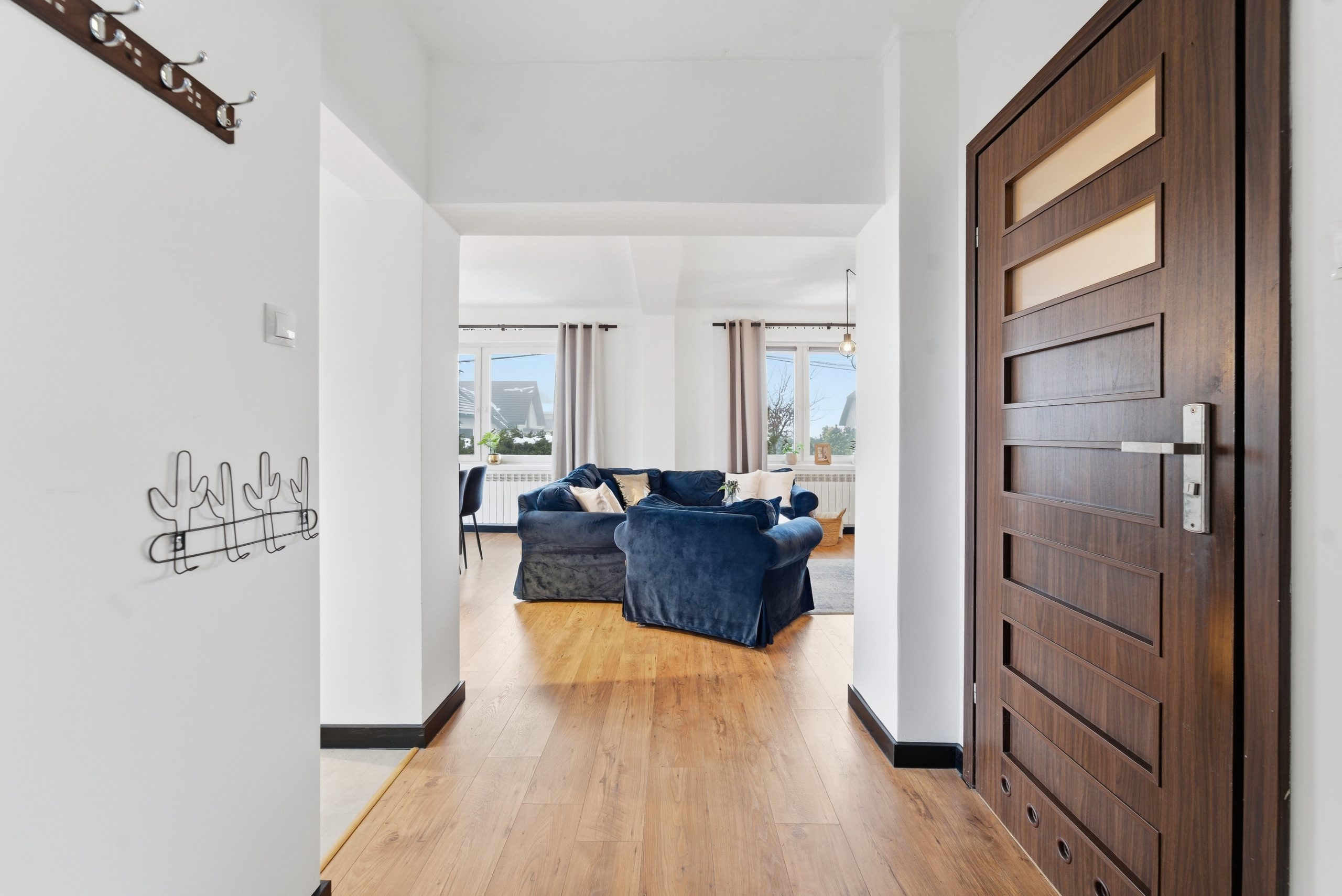 Trzy oddzielne pokoje zapewniają prywatność – idealne jako sypialnie, pokoje dziecięce lub przestrzeń do pracy. Do tego dwie łazienki, zaprojektowane tak, by wygodnie funkcjonowała nawet większa rodzina.