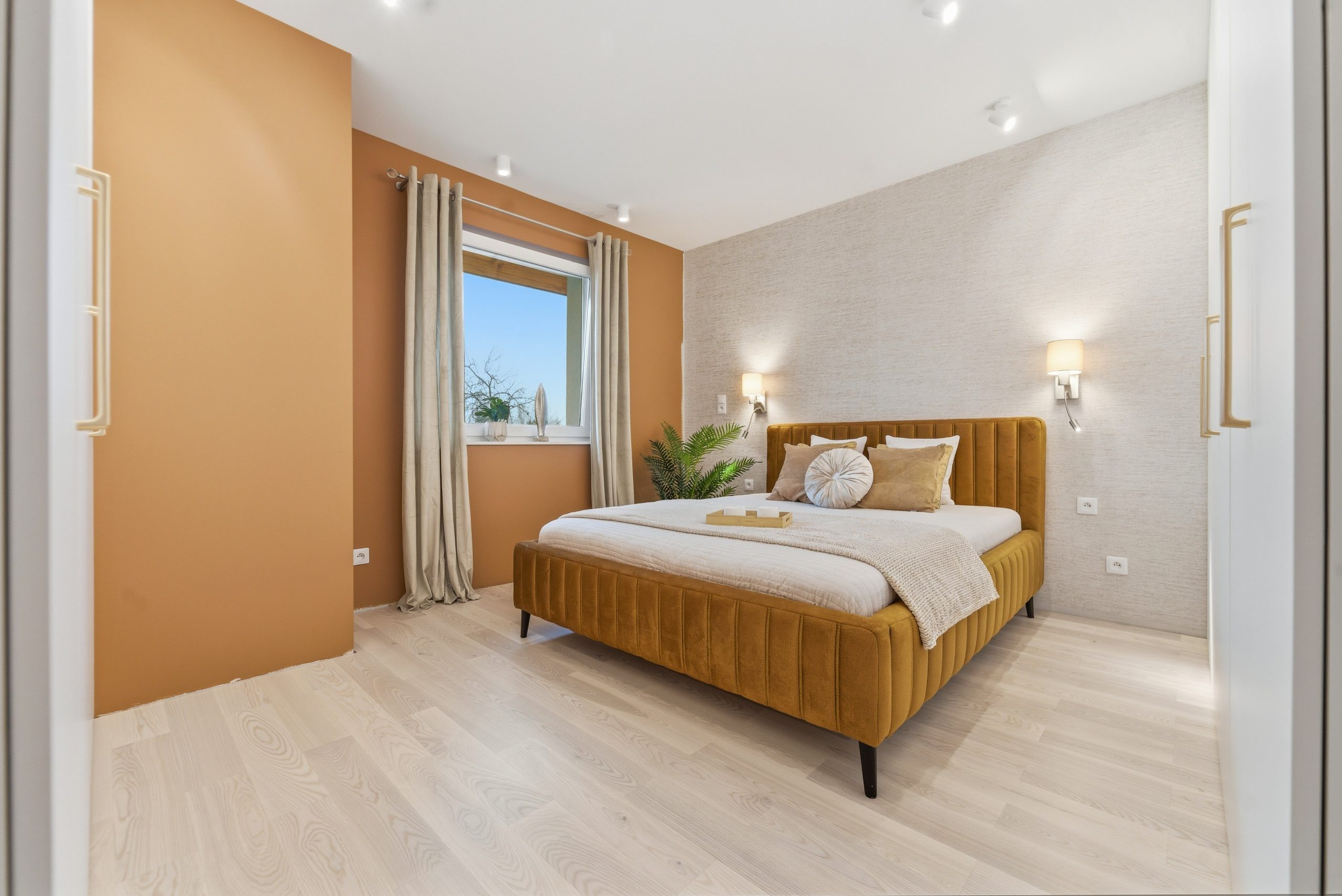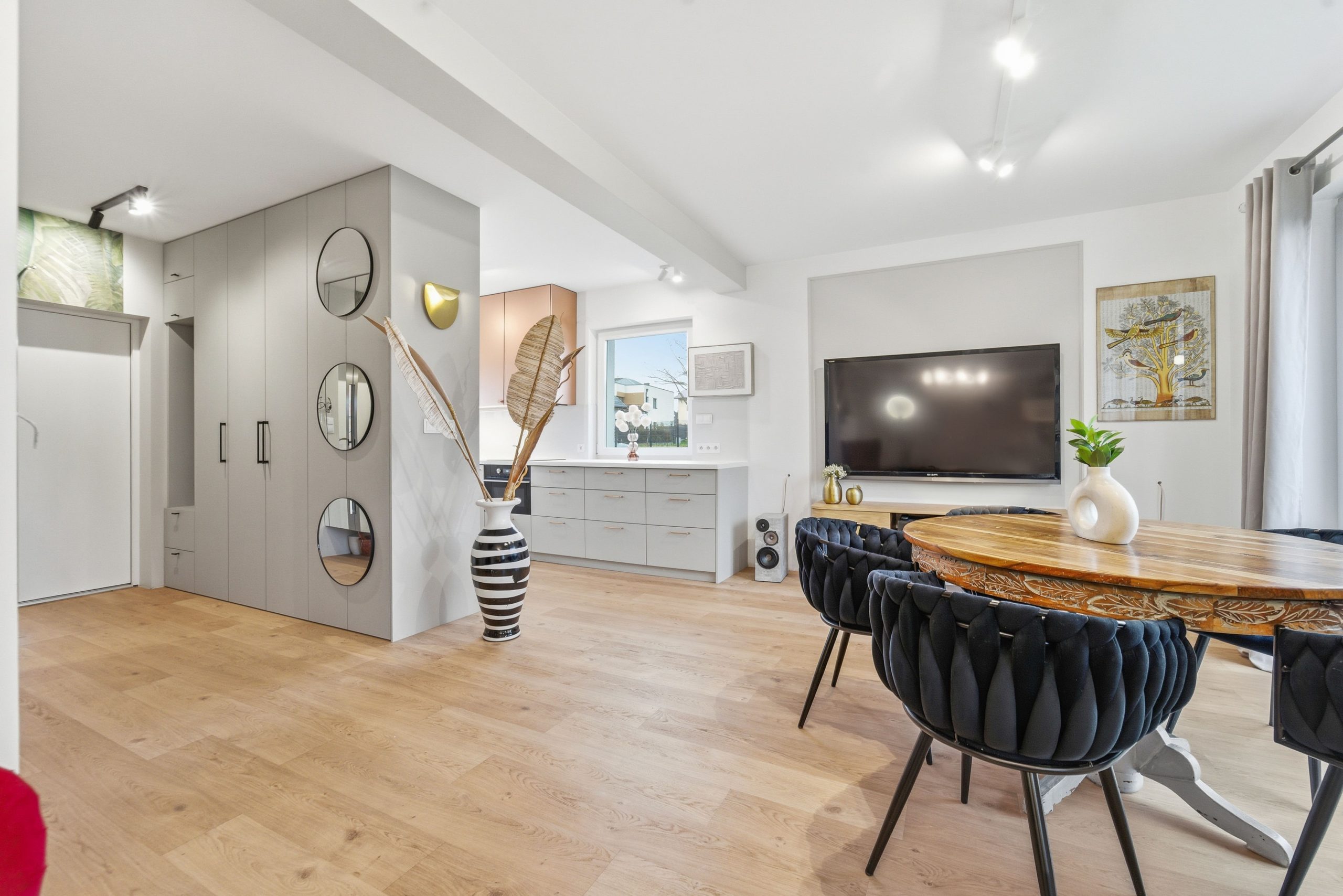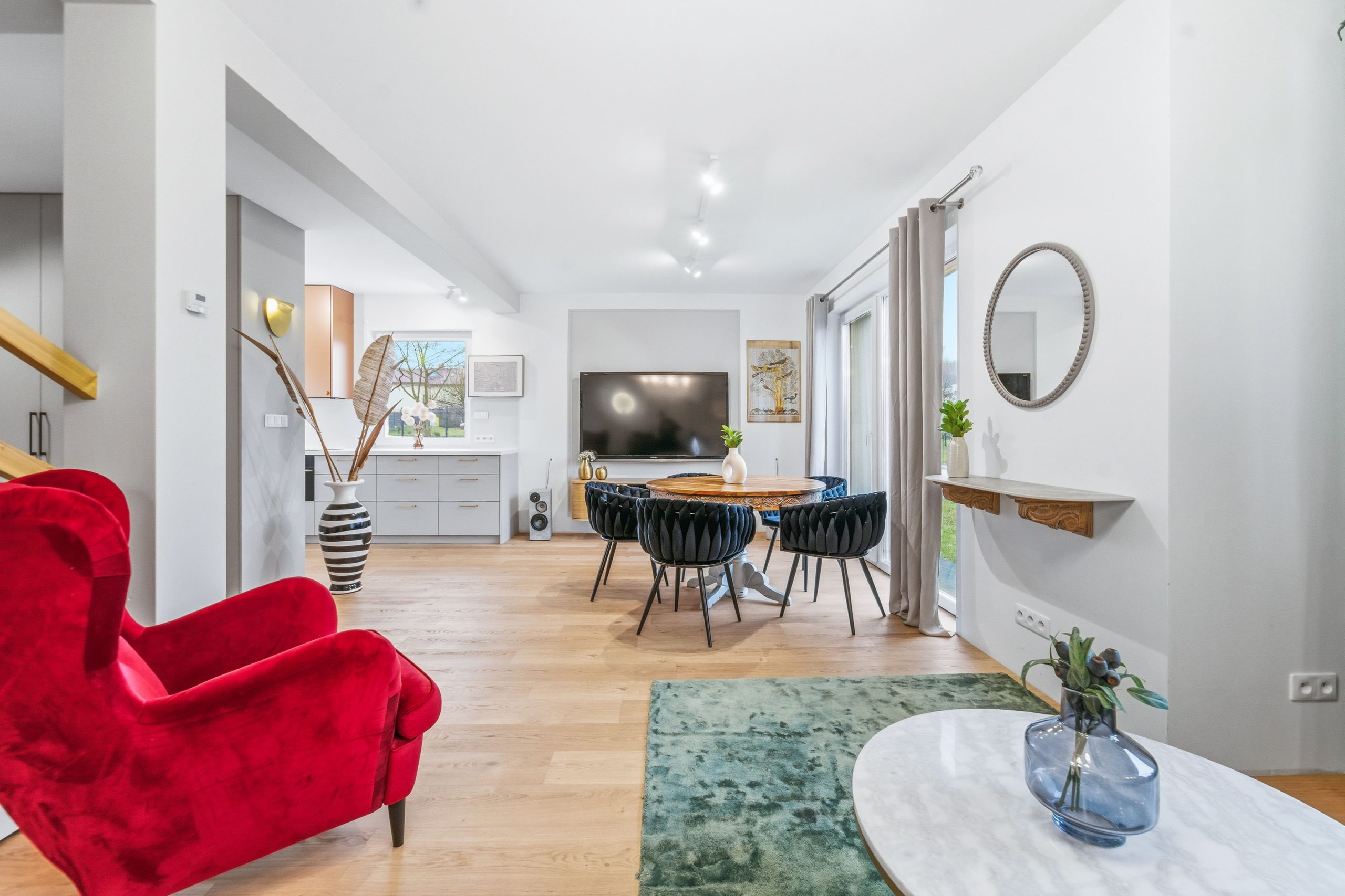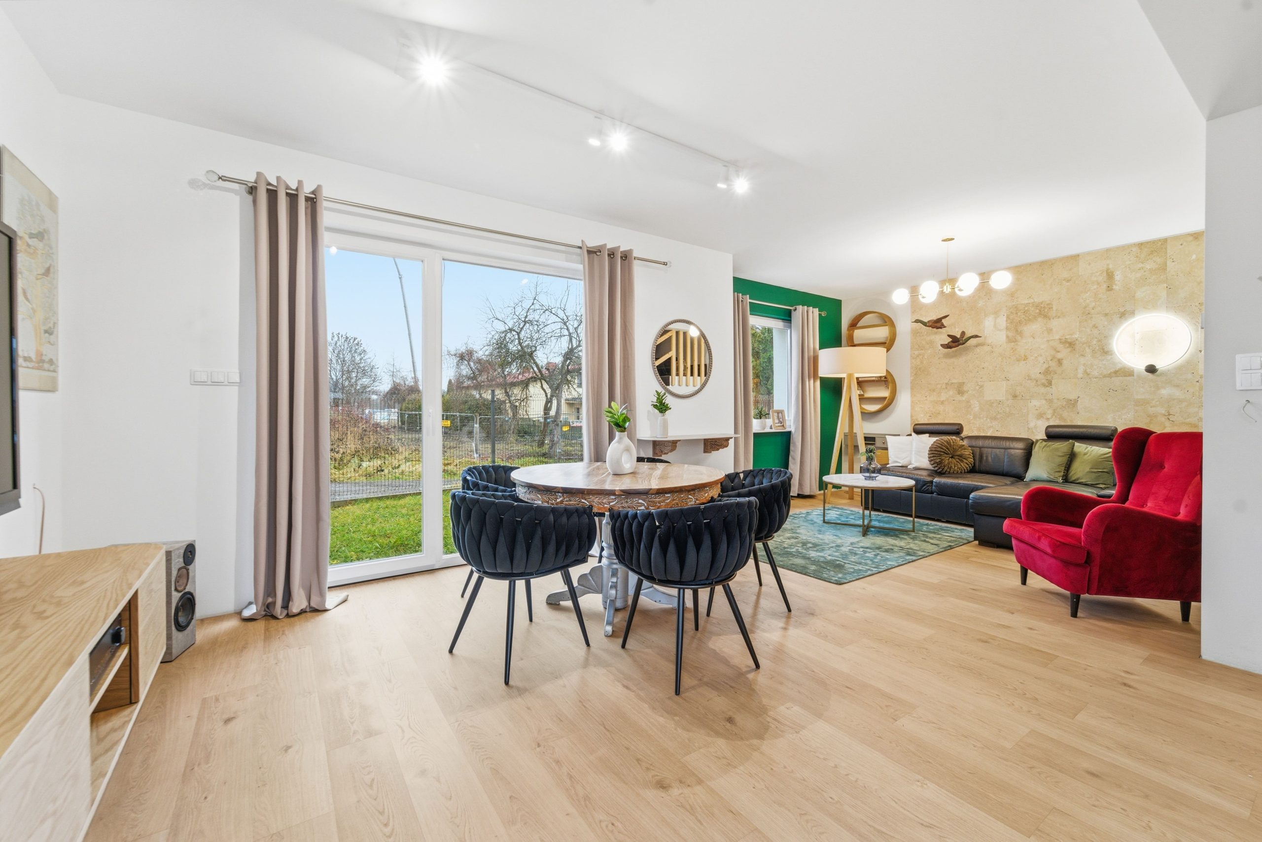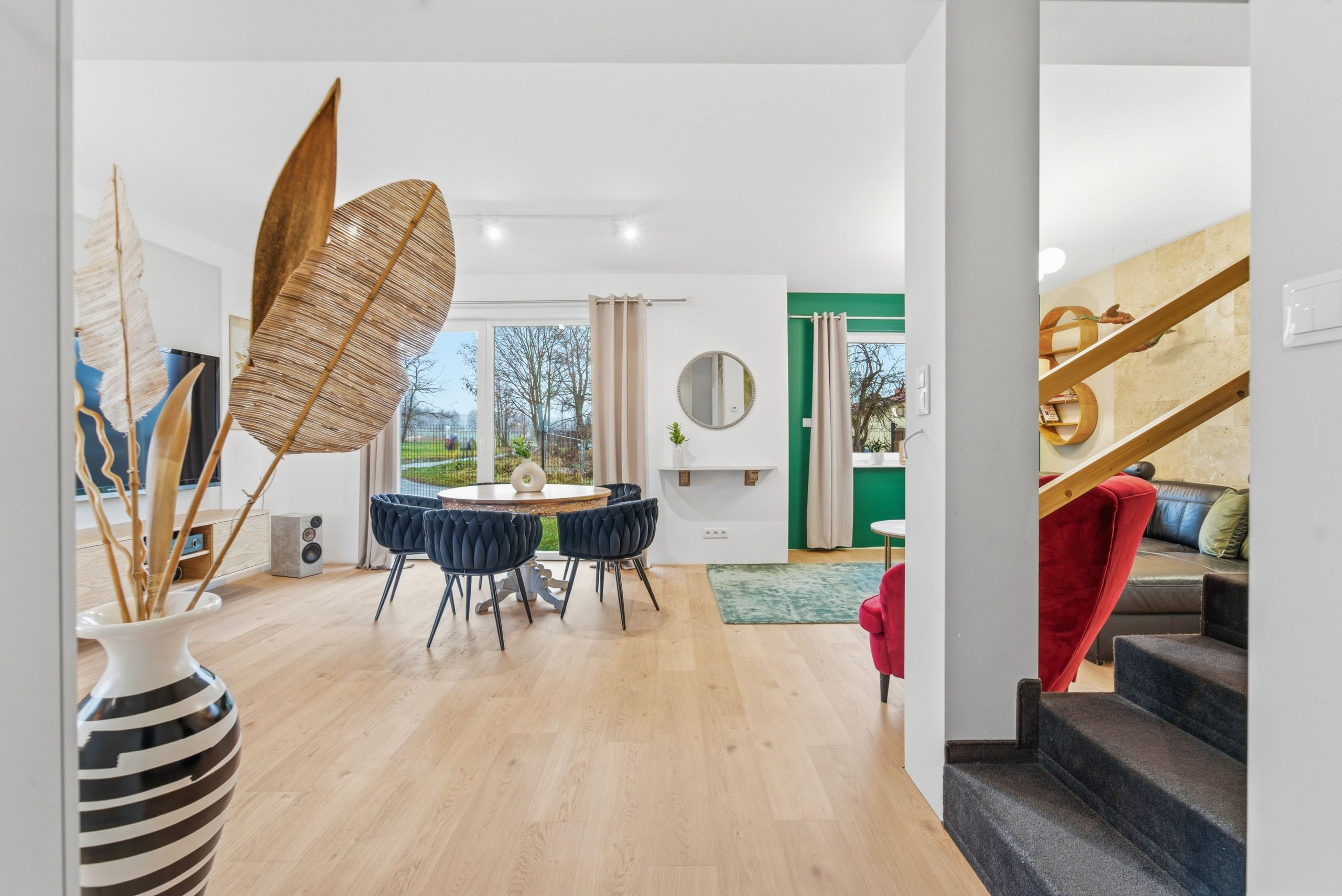 Dom jest jasny, słoneczny i niezwykle przytulny. Ekspozycja na trzy strony świata sprawia, że naturalne światło towarzyszy Ci przez cały dzień, a wnętrza żyją od poranka do zachodu słońca.