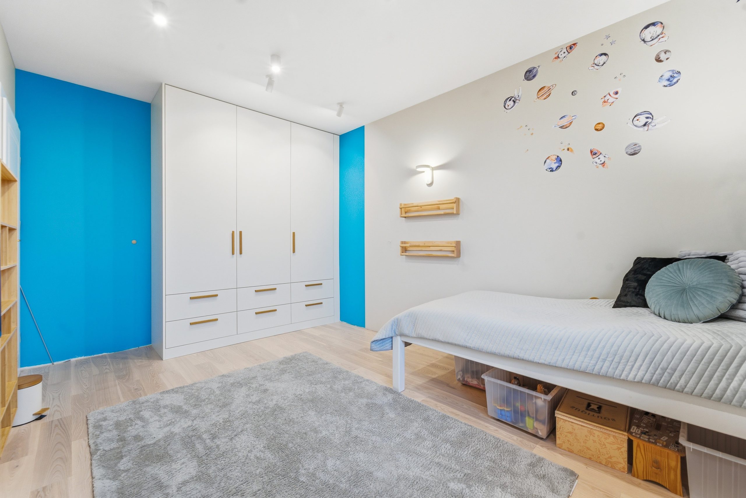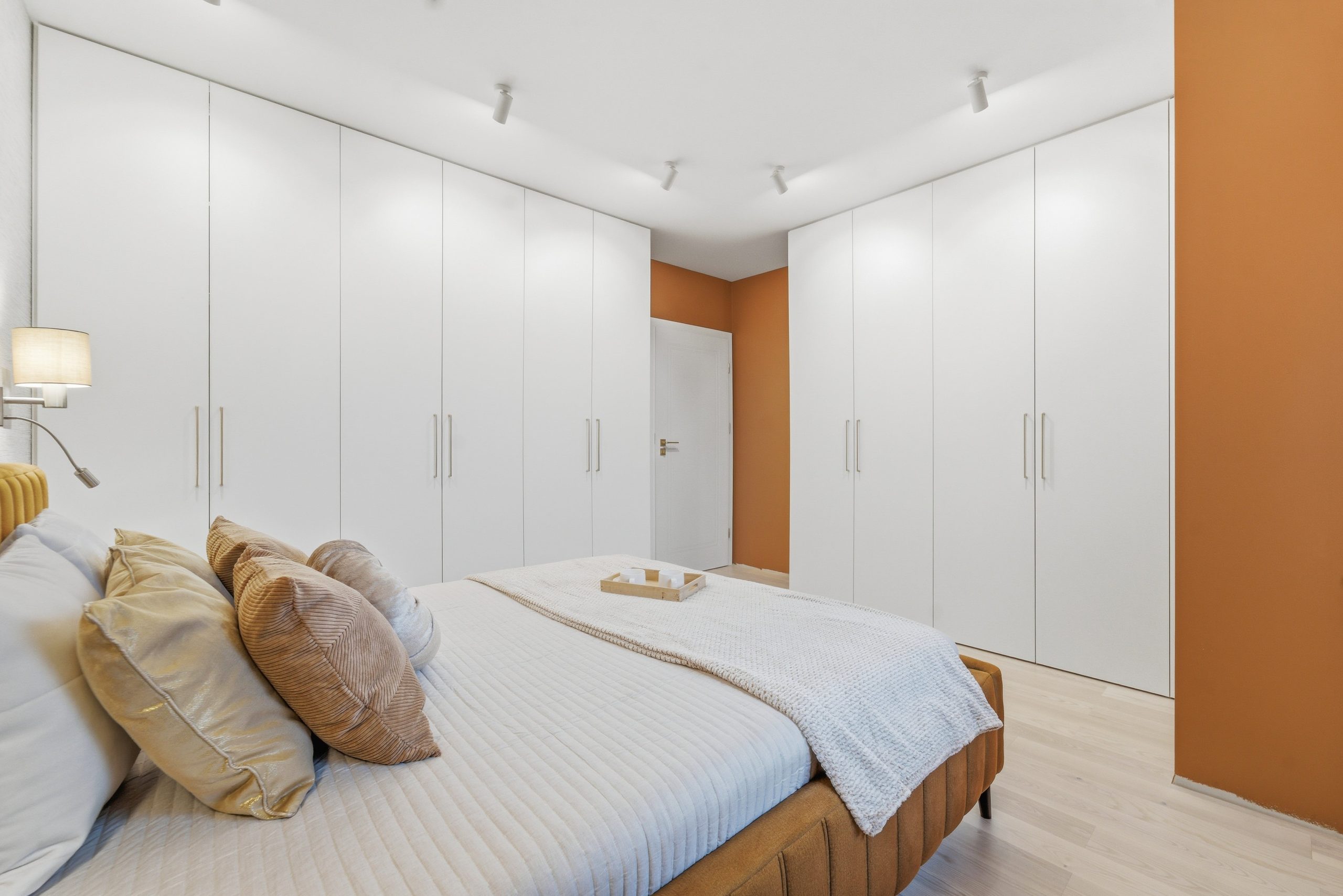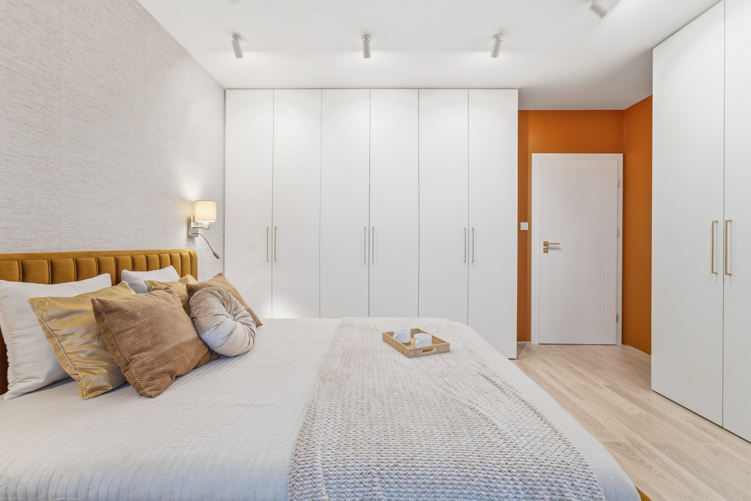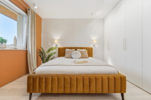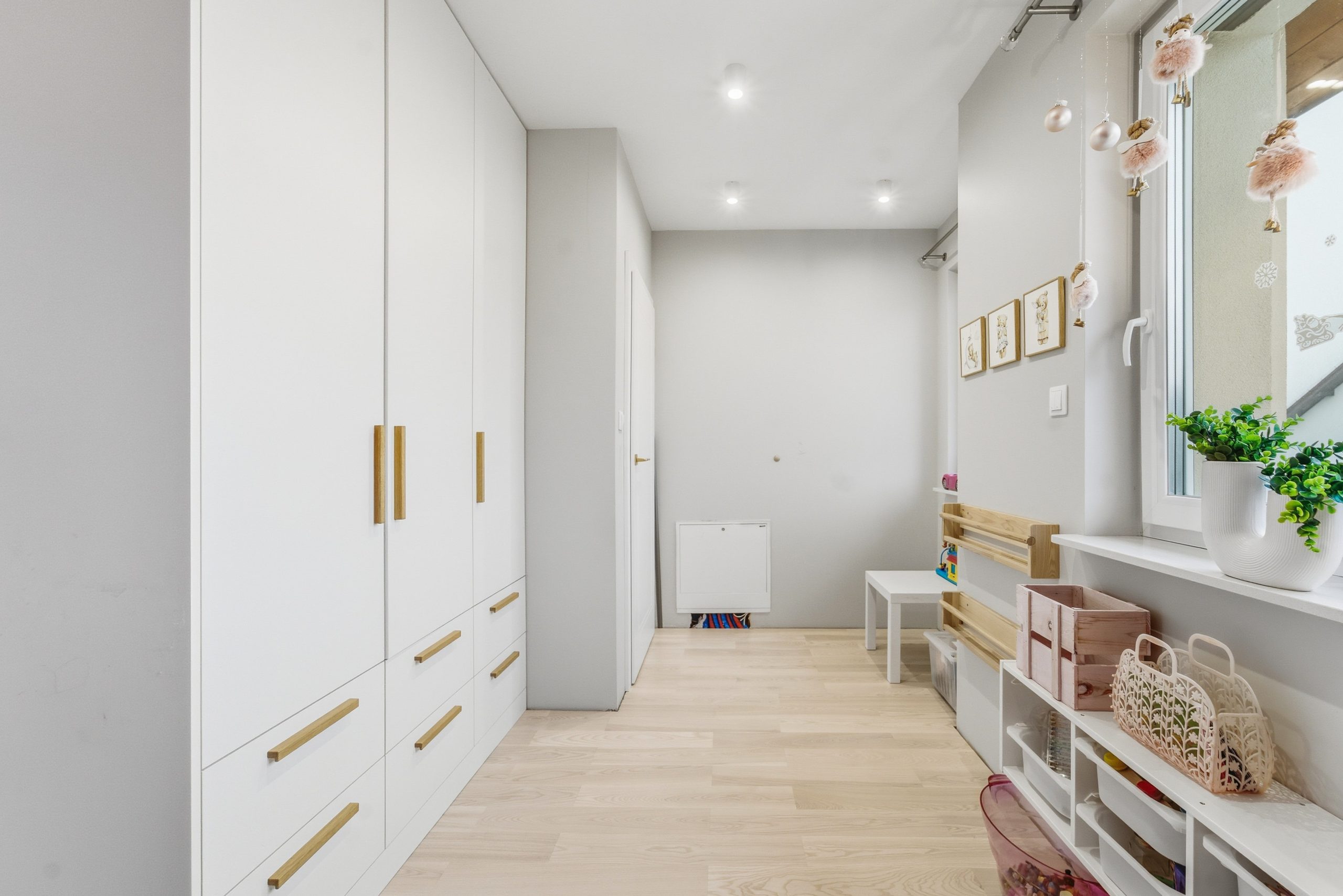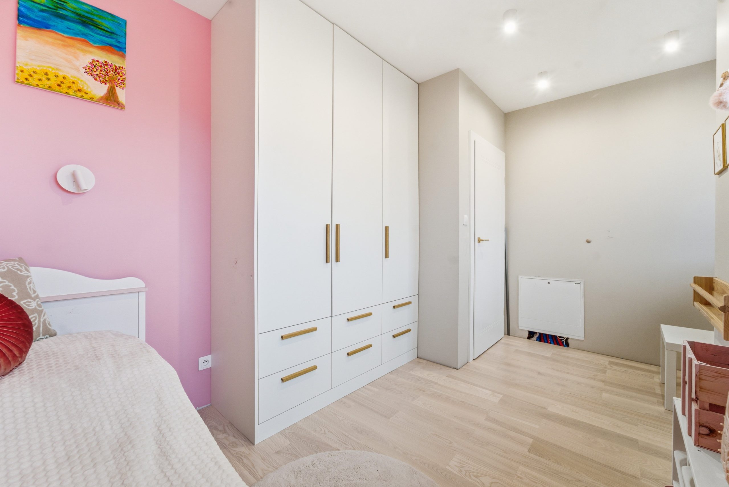 Na piętrze znajdują się trzy oddzielne pokoje, w tym sypialnia z ukrytym, dyskretnym biurem – idealne rozwiązanie dla osób pracujących zdalnie.