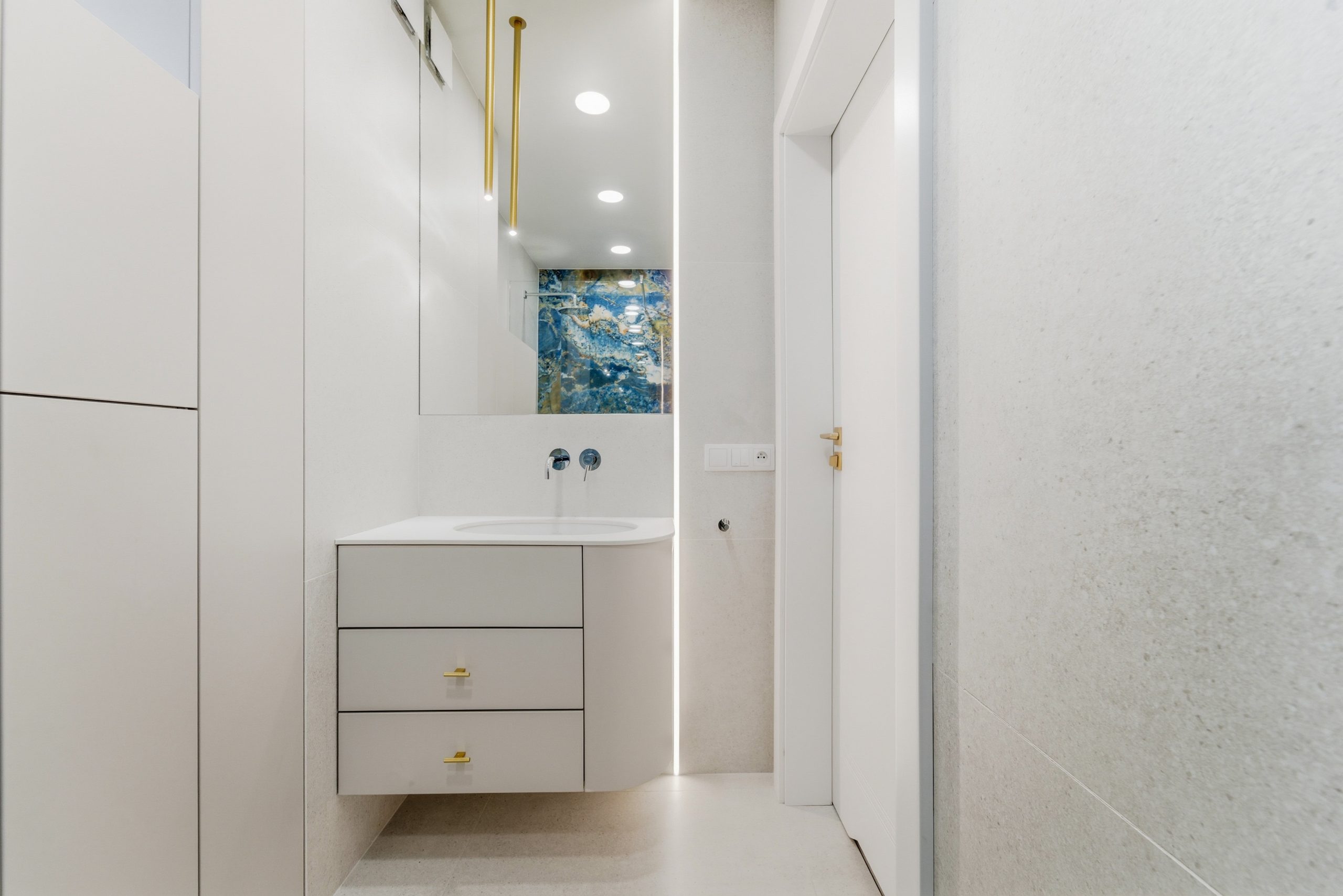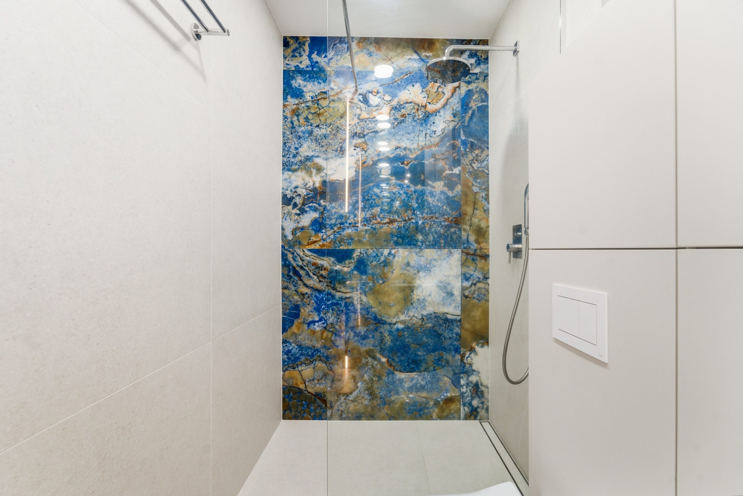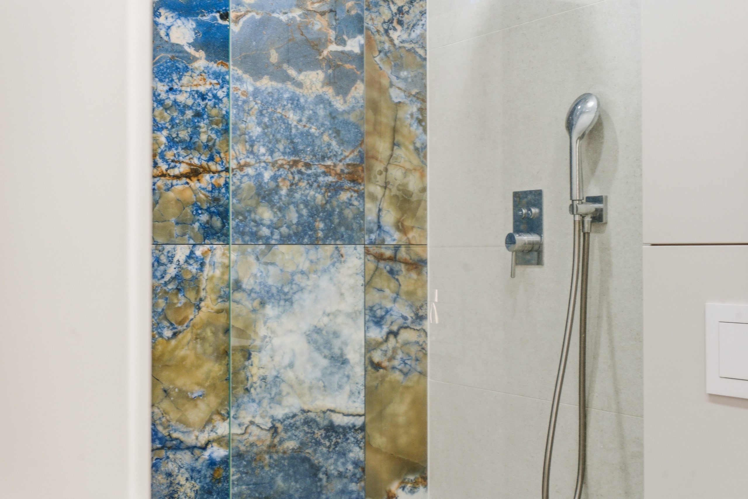 W salonie uwagę przyciąga naturalny kamień – trawertyn, materiał ponadczasowy, elegancki i zawsze modny.