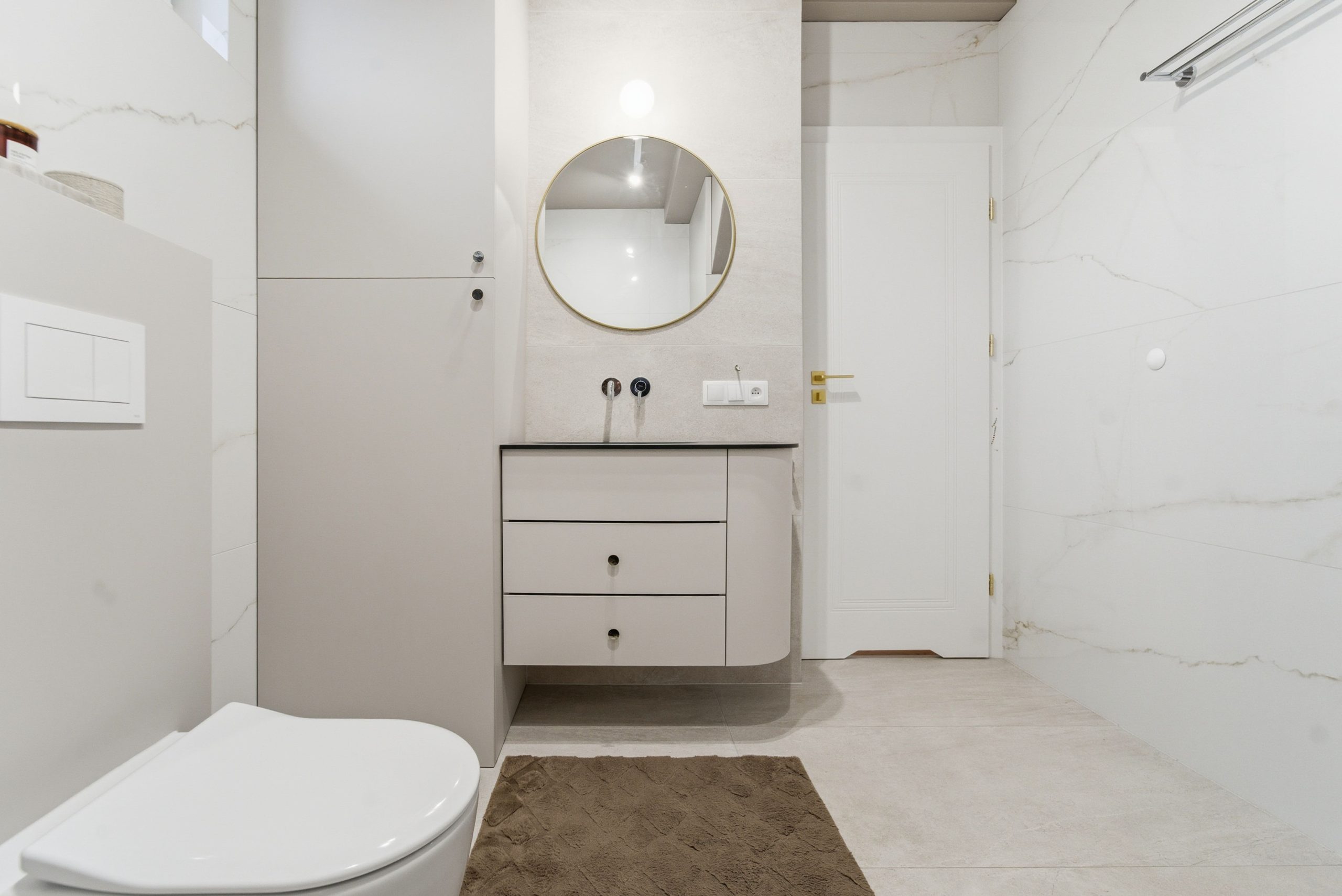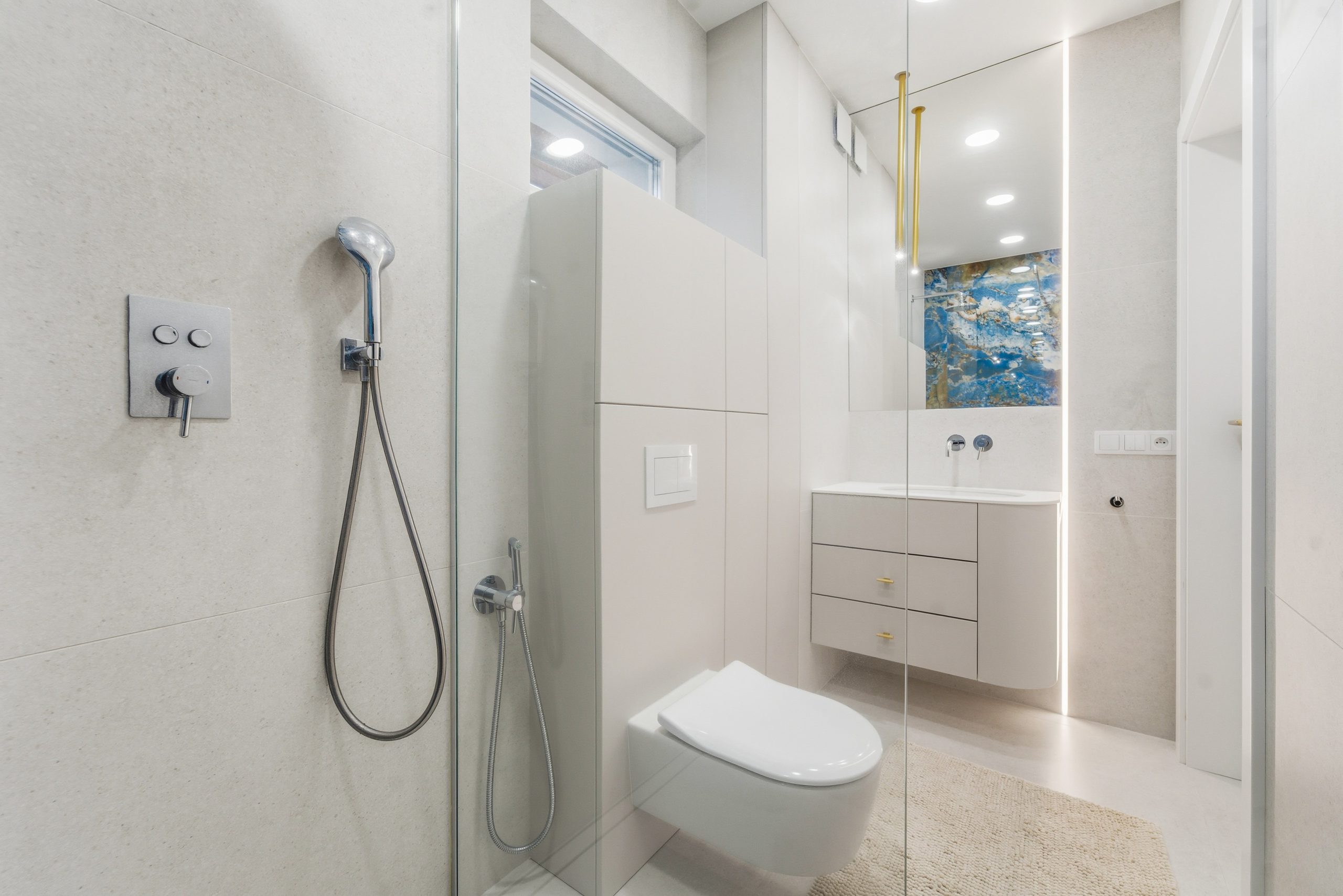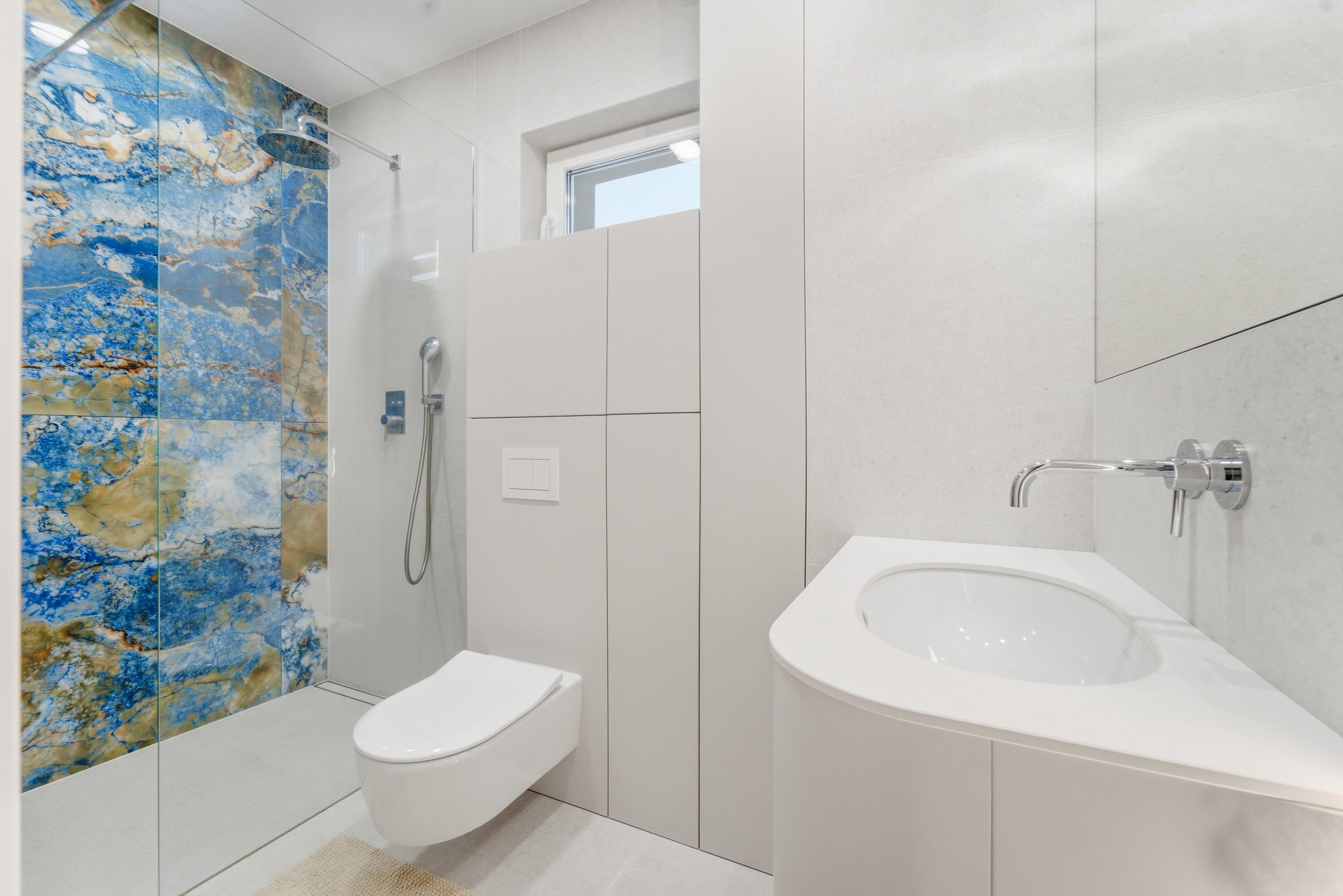 W salonie uwagę przyciąga naturalny kamień – trawertyn, materiał ponadczasowy, elegancki i zawsze modny.