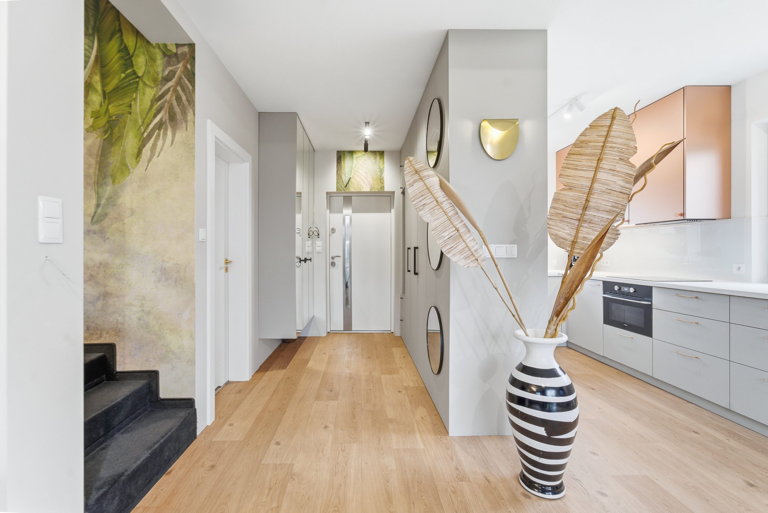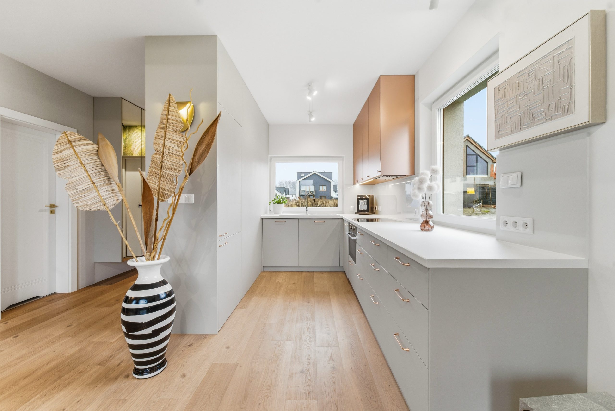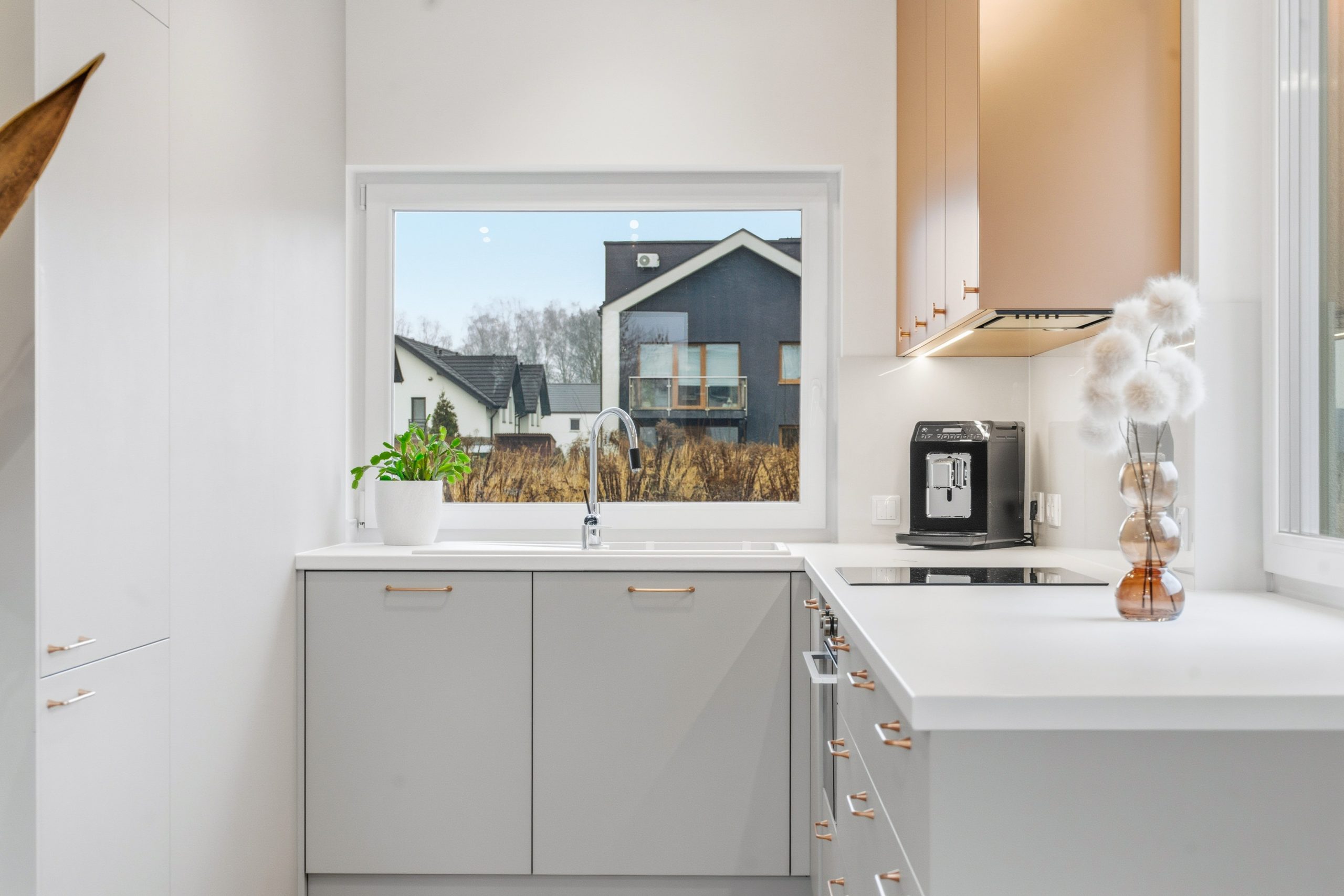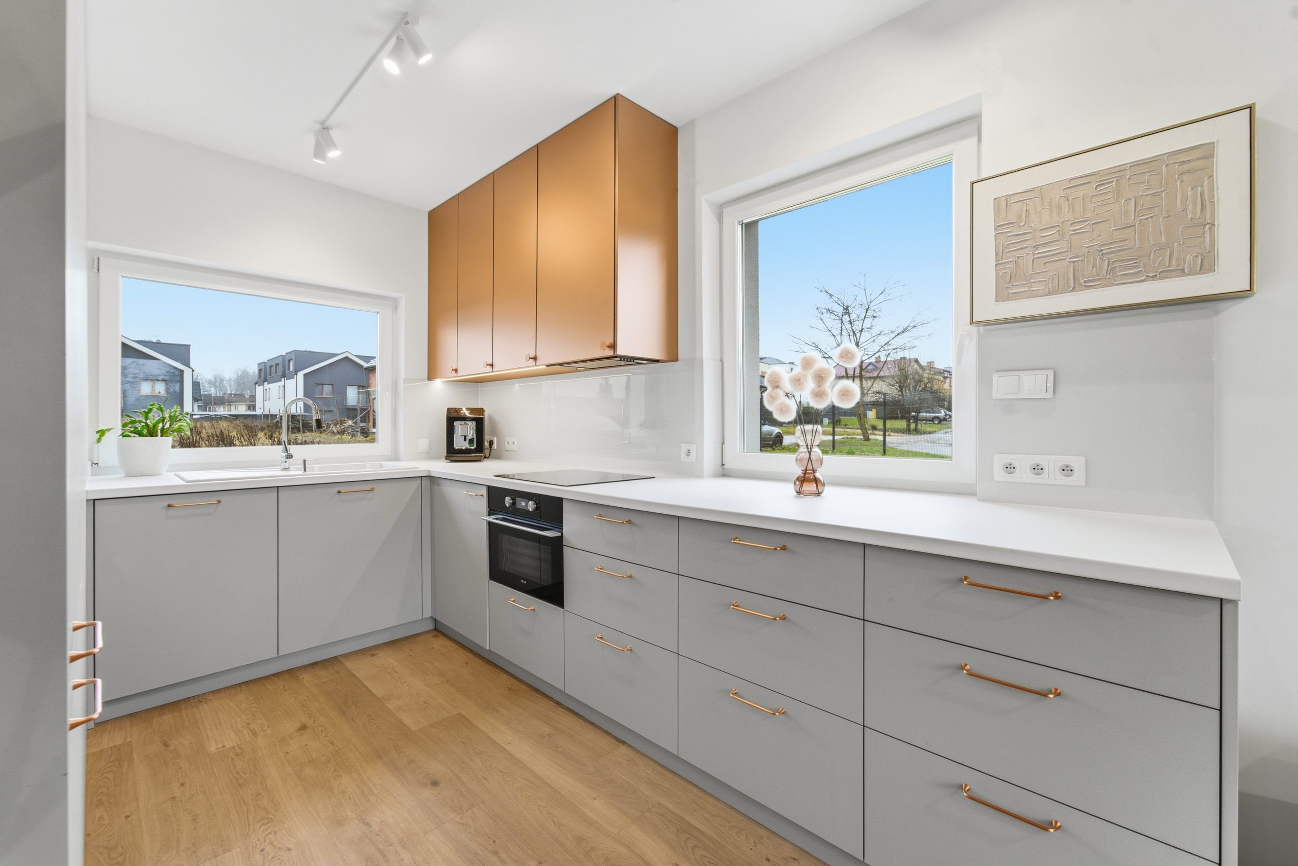 Parter to przestronny salon z jadalnią i nowoczesną kuchnią – miejsce spotkań, rozmów, wspólnych poranków i wieczorów. Kuchnia wykonana pod zabudowę, w pełni wyposażona w sprzęt AGD (lodówka z zamrażarką, zmywarka, piekarnik, płyta indukcyjna, okap) zachwyca designem i funkcjonalnością. Miedziane fronty z akrylu, włoskie płyty laminowane z imitacją skóry i systemy BLUM oraz HETTICH to klasa premium widoczna na każdym kroku.