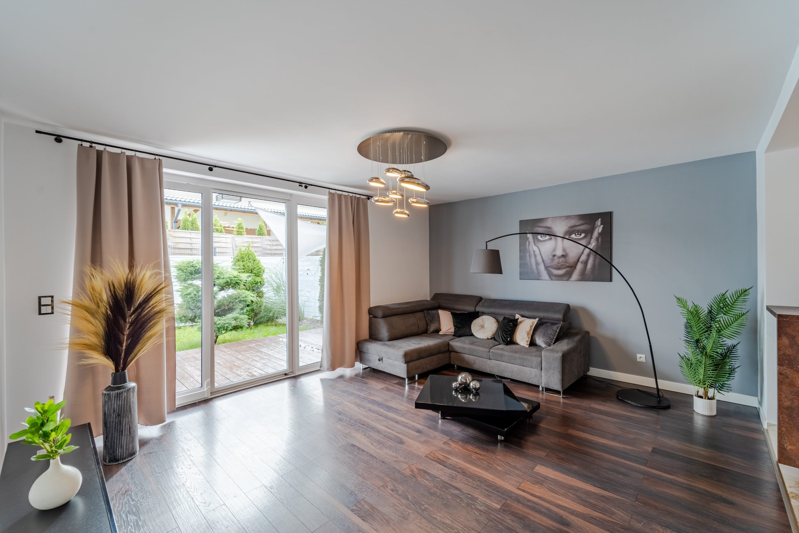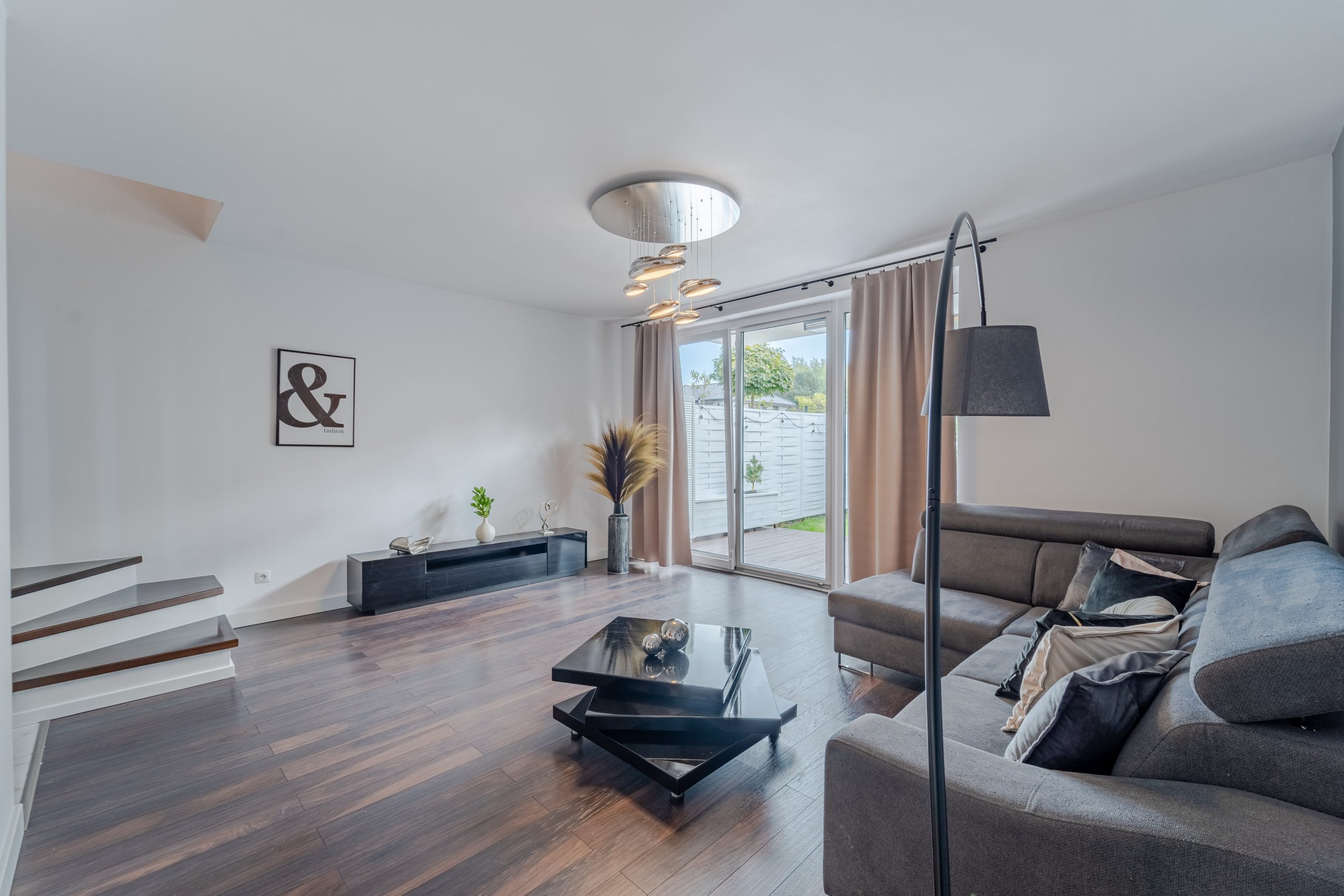 • Przestronny salon z bezpośrednim wyjściem na urządzony ogród – idealne miejsce na relaks po pracy lub spotkania z bliskimi.
